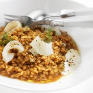 While the pearl barley is cooking, prepare the fried capers: remove them from the marinade, pat them dry with a paper towel for one to two minutes, and then coat them in flour.