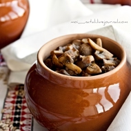 Transfer the porridge into small pots (grease them lightly with oil), place the mushrooms on top, pour in the soy sauce, cover with lids, and put them in a preheated oven at 428°F for 25–30 minutes.