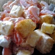 Place the ingredients in a salad bowl, dress with a mixture of mayonnaise and sour cream, seasoned with grated garlic and ground black pepper.