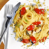 Prepare the bavette: dissolve sea salt in a pot of boiling water and cook the pasta for about seven minutes. Once it's ready, drain the water and transfer the bavette to the skillet with the fish and vegetables. Toss everything together and sauté for another minute.
