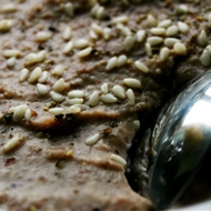 2. Place the beans (without the broth, bay leaf, and pepper) in a blender bowl. Add sesame seeds, peanut butter, oil (I used flaxseed oil, sunflower oil is also fine, but preferably unrefined. Ideally, sesame oil, I think). Blend until smooth. If the mixture is too thick, add a little broth from the beans. Add garlic and ginger. Blend until you achieve a smooth consistency.