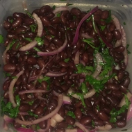 In a bowl, combine the beans, parsley leaves, olive oil, vinegar, and thinly sliced red onion.