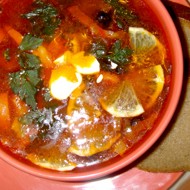 Serve the finished solyanka in bowls, adding herbs, lemon, garlic, and sour cream.