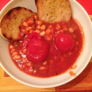 Bean, tomato, and sage soup served with toasts.