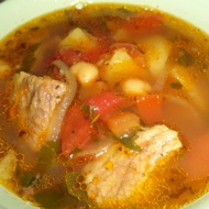 Soak the chickpeas for several hours. Then take the beef, cut it into cubes, add the chickpeas, and cover with water (4 l). Bring to a simmer over low heat.