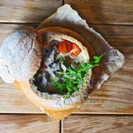Cut off the top of the bread and remove the inside; it will not be needed anymore. However, the cut-off top should be saved and used for serving. Toast the prepared bread in the oven at 356°F for 5 minutes until it has a crispy crust. Ideally, the bread should be homemade, straight from the oven.