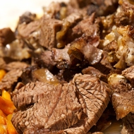 Cut the meat into small pieces and brown them in a well-heated skillet. Transfer to a plate.
