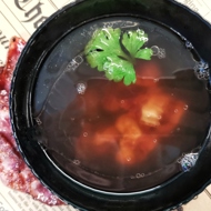 Strain the finished broth, season with salt to taste. Add the bacon and serve.