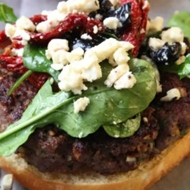 In a skillet over medium heat, heat vegetable oil. Fry the patties, flipping them occasionally. In a small bowl, mix feta cheese, arugula, finely chopped olives, and sun-dried tomatoes. Drizzle with the remaining olive oil and lemon juice. Season with salt and pepper.