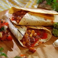 Sprinkle the tortillas with cheddar cheese, layer the filling on top, and fold them up.