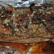 Rub the marinade onto the beef. Place it in a regular bag and wrap it with rosemary sprigs from all sides.