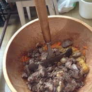 Take a cleaver and diligently chop the contents of the bowl. I always chop the pâté. These little pieces create an indescribable sensation.
