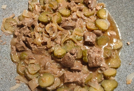 For this recipe, you can also use pickled cucumbers. If using beef liver from an adult animal, you can remove the membranes. Chicken liver can also be used here. No salt is added because the brine from the cucumbers and the cucumbers themselves contain salt.
