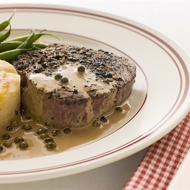 Cut the meat into 2 steaks. Season with salt and pepper. Melt 1 tablespoon of butter in a skillet over medium heat. Place the meat in the skillet and cook for 4 minutes on each side, then transfer to plates. Bring the sauce to a boil, season with salt and pepper.