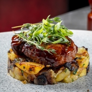 On a plate, place the potatoes with mushrooms, topped with the beef medallion.