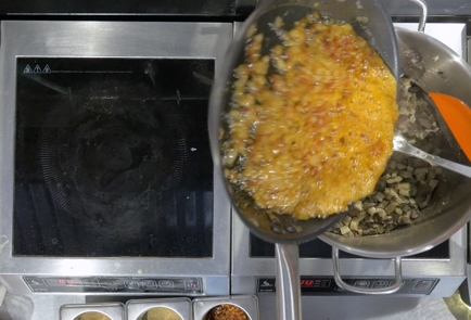 Continue frying and add the dry spices, garlic, salt, pepper, and vinegar.