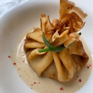 Fold the pancake into a pouch and secure it with a skewer or a green onion stalk.