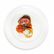 Once all components of the dish are ready, arrange the meat on a plate and place the foie gras on top. Next to it, add a baked potato and a spoonful of sour cream. Drizzle the meat with sauce and finish by sprinkling with truffle oil.