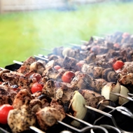 On skewers, alternate threading the meat, cherry tomatoes, and pieces of green onion. Grill for about 5 minutes on each side until the meat is cooked through.