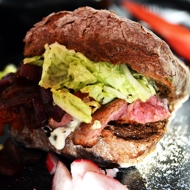 The most interesting and delicious part is assembling the burger. For this recipe, I took rye ciabatta (if it’s stale, just warm it in the microwave for a couple of minutes), cut it in half, and added a little bit of everything)) Here you have options - either you assemble the burgers for everyone, or each person adds what they like best - what if there are vegetarians among you (just kidding :-)? That's why I love to just lay out all the fillings on the table.