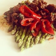 Place a deep skillet over medium heat. Add oil, ginger, and garlic. When you smell the garlic, add the meat. Sauté for a few minutes until the meat is cooked through. Add chili pepper and asparagus. Sauté briefly. Pour in soy sauce and a splash of white wine. Simmer for a few more minutes. Remove from heat and serve with rice.