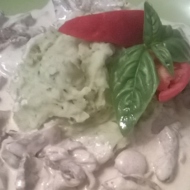 Place the puree in the center of the plate and arrange the beef stroganoff around it.