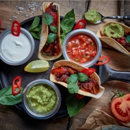 Shape the taco shells into 'boats' and toast them in a salamander. Fill the prepared mixture into the shells, garnish with cilantro, a wedge of lime, and serve with sour cream, tomato salsa, and guacamole on the side.