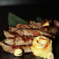 Slice the meat into strips lengthwise and drizzle with the sauce. Garnish with the apple rose. It can be served on wooden dishes.