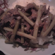 When the beef is tender and almost no liquid remains, add the onion and carrot (cut as you like) and the garlic scapes.