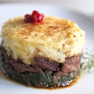 Beef with Mashed Potatoes, Spinach, and Berry Sauce