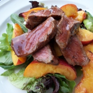 Cut the boiled beef into portion-sized pieces (for an appetizer) or strips (for a salad). Slice the peaches lengthwise into pieces equal in thickness to the sliced meat.