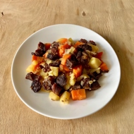 Beef with Prunes on a Vegetable Bed in the Oven