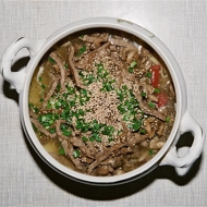 Heat the chicken broth. Cook the noodles in salted water until done, then drain. In a larger serving dish, first layer the noodles, then top with the beef and mushrooms, add two tablespoons of chili sauce, and pour the broth over. Finally, sprinkle with chopped green onions and sesame seeds.