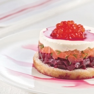 Take bottomless molds and place them on white toast cut into even circles and toasted with a splash of vegetable oil. Fill each mold tightly with a beet mixture. Next, add a layer of trout. Follow this with a thin layer of Philadelphia cream cheese. Top the white cheese with a small spoonful of red caviar. Carefully remove the molds.