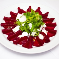 On a plate, arrange the boiled beetroot in waves, and in the center, place a mound of mixed salad. Sprinkle with goat cheese flakes. Drizzle with garlic oil and garnish with pine nuts.