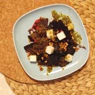 Dice the beetroot, drizzle with pesto sauce, serve, and garnish with toasted pine nuts. You can also add slices of goat cheese for extra flavor.