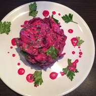 Remove the leaves from the parsley. Thoroughly mix the chopped beets and onions with the parsley leaves and the dressing, and let it sit for twenty minutes. Before serving, toss the salad with ricotta cheese, and season with salt and pepper to taste.