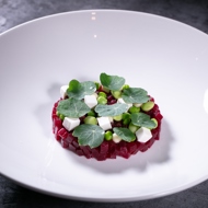 The closest analogy to this strictly vegan tartare from Chef John Smith is the well-known beet salad with feta cheese and walnuts. However, the tofu, which plays the role of feta here, lacks the creaminess and saltiness typical of brined cheese. Therefore, the flavor of the dish leans more towards freshness than density: the contrast with the sweet beetroot is provided by the lively green peas with a menthol hint of fresh mint, transformed into a sauce, while lemon zest in the dressing contributes the aroma, and the tofu serves as a neutral backdrop for everything else.