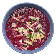Pour the soup into a bowl and garnish with pieces of goat cheese, julienned apple, finely chopped chives, and drizzles of Extra Virgin olive oil.