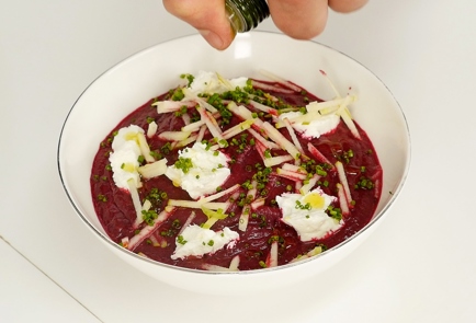 Remove the beetroot from the oven and let it cool. Peel and place it in a blender, adding Extra Virgin olive oil, balsamic vinegar, and salt. Blend lightly, then add 200 ml of broth and blend again until smooth.