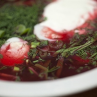 Finally, place all the vegetables and herbs in each bowl, add the meat if desired, then pour over the beetroot concentrate, and garnish with halved quail eggs and sour cream. That's it — your fresh summer soup is ready!