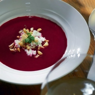 Blend the vegetables until smooth. Transfer to a pot, add beet juice, stir, and bring to a boil. Season with salt and pepper, then let it cool.
