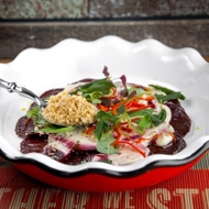 On the salad, place the marinated beet slices, add the artichoke paste, mix in the ricotta, and torch with a gas burner.