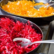 Peel and rinse the beets. Wash and peel the carrot. Cut the vegetables into strips, add finely chopped parsley or celery root. Place the vegetables in a pot, add vegetable oil and vinegar, pour in a small amount of water, and stir. Cover the pot with a lid and stew the vegetables for 45–60 minutes, stirring occasionally and ensuring they do not burn.