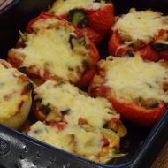 Stuff the pepper halves with the vegetable mixture and top with grated suluguni cheese.