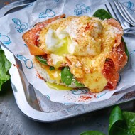 On the baked toast with cheese, layer fresh spinach leaves, lightly salted salmon, and the poached egg.