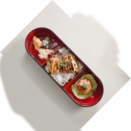 Place all prepared items in the bento box: tempura, chicken donburi (arrange sliced chicken breast over cooked rice), and a rice ball topped with tuna tartare on a lettuce leaf. Garnish all sections of the bento with chopped green onions.