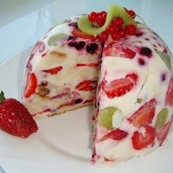 Line a deep bowl with plastic wrap and place a layer of berries at the bottom, followed by a layer of broken sponge cake pieces. Repeat with another layer of berries, and so on. Pour the sour cream and gelatin mixture over the layers. Refrigerate for 2 hours. Carefully invert the cake onto a serving plate.