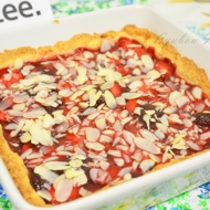 Mix the remaining jam with 0.5 tablespoons of water and bring to a boil. Remove the pie from the oven, brush it with the jam, and sprinkle with almonds.