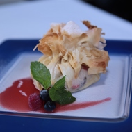 Place the sponge cake on the phyllo dough, add fresh berries. Shape into a 'pouch'. Bake in the oven at 392°F for 5-7 minutes.